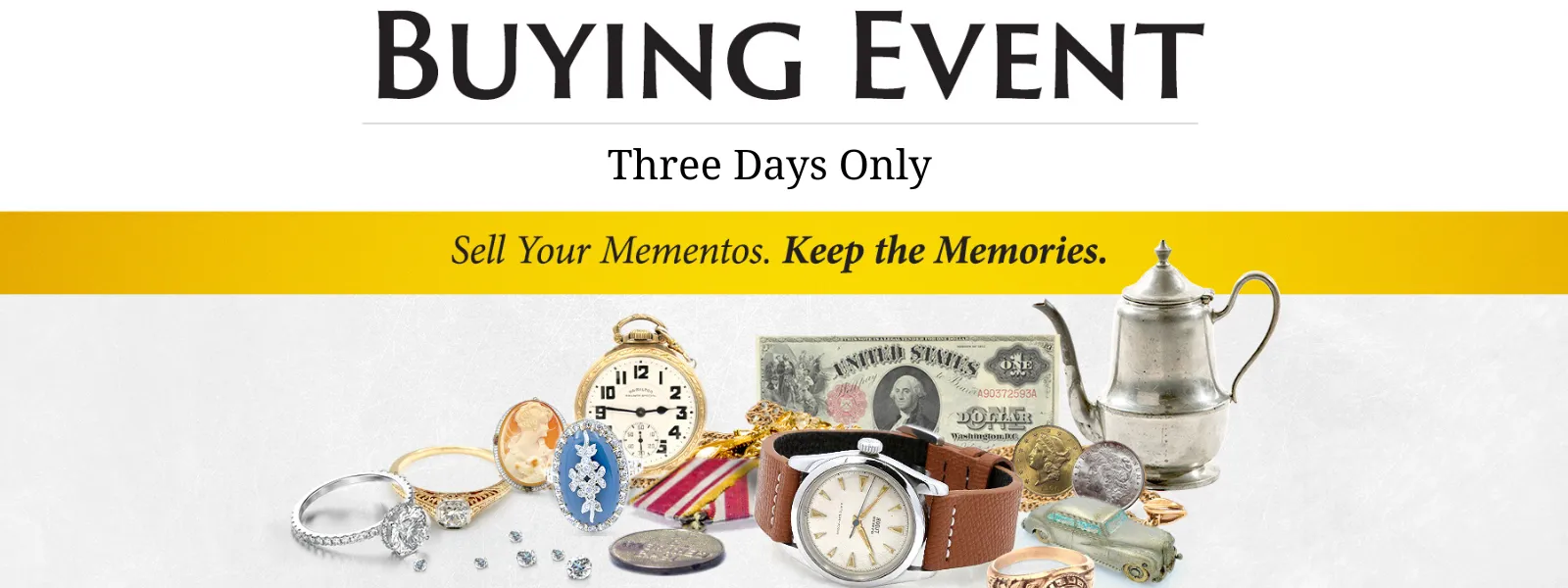 Have you ever wondered what your valuables are really worth? During our buying event happening at both of our locations three times per year, we will be paying top dollar for all of your jewelry, watches and other collectibles!